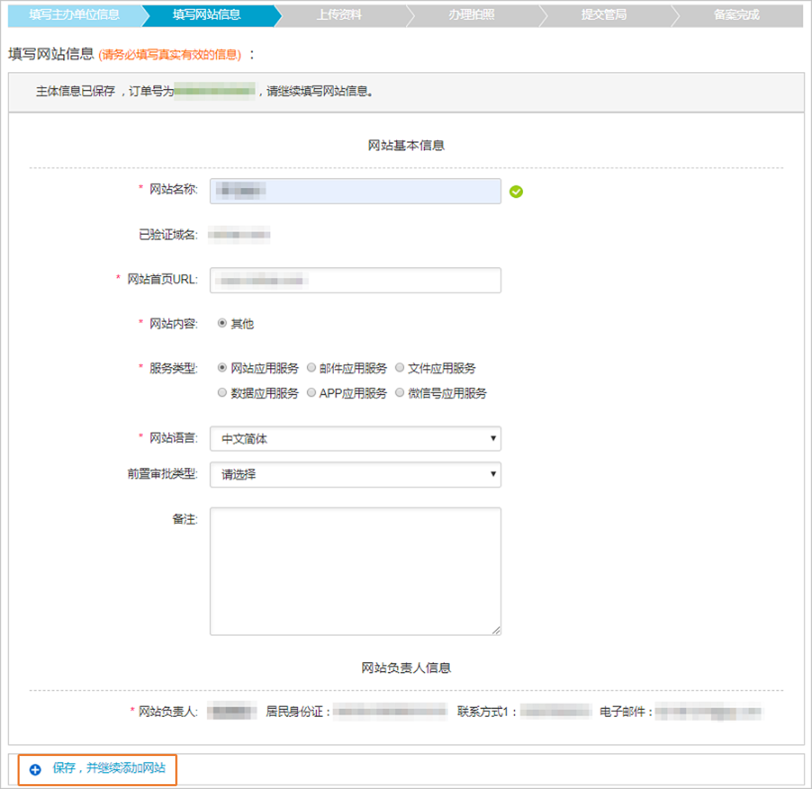 需填寫的信息 主體為個人 主體為企業(yè) 網(wǎng)站編號 無需填寫,系統(tǒng)自動生成。 網(wǎng)站名稱 產(chǎn)品類型 默認(rèn)為阿里云,無需填寫,系統(tǒng)自動生成。 備案服務(wù)號 系統(tǒng)獲取產(chǎn)品驗證環(huán)節(jié)填寫的備案服務(wù)號,自動填充。 已驗證域名 系統(tǒng)獲取驗證備案類型環(huán)節(jié)填寫的網(wǎng)站域名,自動填充。 網(wǎng)站首頁URL 填寫備案的網(wǎng)站域名首頁URL。 網(wǎng)站內(nèi)容 根據(jù)網(wǎng)站的實際內(nèi)容選擇,個人網(wǎng)站選擇其他 。 根據(jù)網(wǎng)站的實際內(nèi)容選擇,單位網(wǎng)站可選擇單位門戶網(wǎng)站或綜合門戶等。 服務(wù)類型 根據(jù)網(wǎng)站實際情況選擇。 網(wǎng)站語言 根據(jù)網(wǎng)站實際情況選擇,支持同時選擇多種語言。 前置審批類型 您所備案的網(wǎng)站域名,如果涉及前置審批相關(guān)行業(yè),必須辦理前置審批文件,不提供前置審批文件會導(dǎo)致備案審核失敗,具體參見前置審批。 填寫新負(fù)責(zé)人信息 個人備案不支持填寫,個人備案要求網(wǎng)站負(fù)責(zé)人與主體負(fù)責(zé)人必須為同一人。 當(dāng)網(wǎng)站負(fù)責(zé)人與主體負(fù)責(zé)人不是同一個人時,可在網(wǎng)站負(fù)責(zé)人信息欄下選擇填寫新負(fù)責(zé)人信息。 負(fù)責(zé)人姓名 填寫與個人身份證上完全一致的網(wǎng)站負(fù)責(zé)人姓名。 電子郵件地址 系統(tǒng)獲取填寫備案主體信息環(huán)節(jié)填寫的電子郵件地址,自動填充。 填寫可正常接收郵件的有效郵箱。 負(fù)責(zé)人證件類型 負(fù)責(zé)人證件號碼 聯(lián)系方式1 系統(tǒng)獲取填寫備案主體信息環(huán)節(jié)填寫的聯(lián)系方式1的手機(jī)號,自動填充。 聯(lián)系方式2 應(yīng)急聯(lián)系電話 系統(tǒng)獲取填寫備案主體信息環(huán)節(jié)填寫的應(yīng)急聯(lián)系電話,自動填充。 增加備案網(wǎng)站